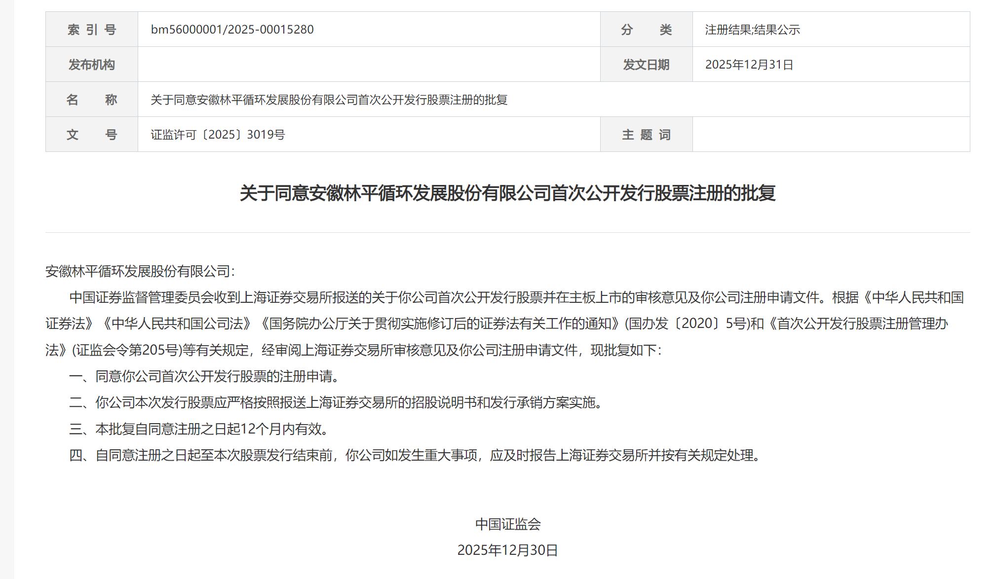智通财经APP获悉,12月31日,中国证监会发布《关于同意安徽林平循环发展股份有限公司首次公开发行股票注册的批复》。据悉,林平发展拟在上交所主 板上市,国联民生证券为其保荐机构,拟募资12亿元。 | 索 引 号 | bm56000001/2025-00015280 | | --- | --- | | 发布机构 | | | श्र N | 关于同意安徽林平循环发展股份有限公司首次公开发行股票注册的批复 | | 粤 文 | 证监许可〔2025〕3019号 | 据招股书,林平发展主要从事包装用瓦楞纸、箱板纸产品的研发、生产和销售,是一家具有自主研发及创新能力的高新技术企业;经过多年发展,公司已成 长为集废纸利用、热电联产、绿色造纸于一体的资源综合利用企业。公司一直重视环境保护、节能降耗工作,公司通过废纸利用、污水处理、白水和中水回 用、沼气燃烧发电、污泥回用、热电联产、绿色制造等工艺,实现资源的循环利用和可持续发展。 公司主要产品包括瓦楞纸、箱板纸,公司产品销往下游制作成瓦楞纸箱,被广泛应用于物流运输、工业品及消费品包装领域。 ...