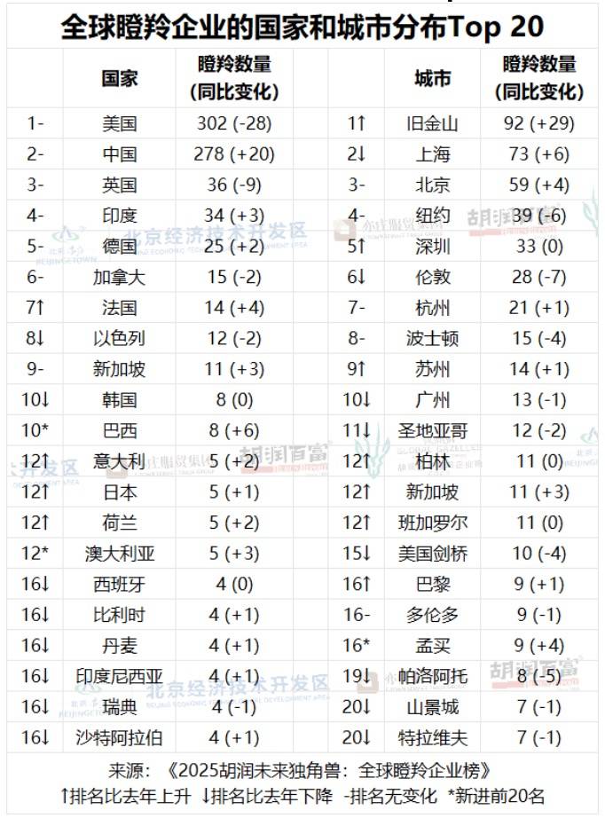 2025胡润全球瞪羚企业榜发布:美国和中国分别有302家和278家上榜,占比七成