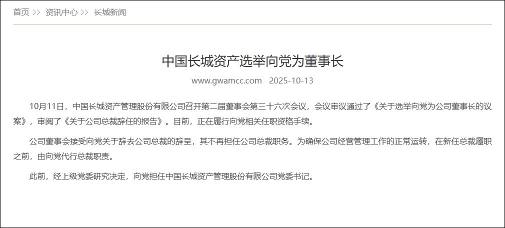 10月13日,中国长城资产管理股份有限公司(以下简称为"中国长城资产")发布公告称,公司于10月11日召开第二届董事会第三十六次会议, 决定选举向党为董事长。此前,向党已任中国长城资产党委书记。 公告称,公司董事会接受向党关于辞去公司总裁的辞呈,其不再担任公司总裁职务。为确保公司经营管理工作的正常运转,在新任总裁履职之 前,由向党代行总裁职责。 业务方面,长城资产紧紧围绕金融不良资产主业。当前,长城资产经营聚焦于中小金融机构改革化险、实体经济纾困重组、资本市场风险化 解、房地产风险化解四大领域。 发展迄今近九年,长城资产先后历任四任董事长,其中张晓松、沈晓明、李均锋均为到龄退休辞任,向党将"接棒"成为长城资产第四位董事 长。值得注意的是,自2024年12月长城资产原董事长李均锋到龄退休以来,董事长一职处于空缺状态。 据长城资产官网介绍,向党为重庆大学技术经济及管理专业博士,高级经济师。1992-1999年历任上海宝钢五冶质监处、中国建设银行重庆分行 委代处干部。 向党拥有多年的金融资产管理公司工作经验。在加入长城资产前,向党曾在中国信达资产管理股份有限公司工作多年。 1999-2010年,向党历任中国信达资产 ...