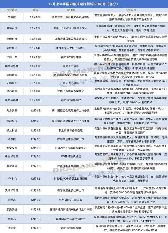 进入岁末,集成电路领域迎来了资本与产业共振的"IPO狂飙期"。据全球半导体观察不完全统计,短短 半个月内,超20家企业密集推进上市进程,覆盖IC设计、半导体设备、半导体材料等产业链环节。 摩尔线程登陆科创板成为"国产GPU第一股"、壁仞科技获证监会境外上市备案,冲刺港股、纳芯微完 成"A+H"双平台布局、天域半导体港股挂牌,再加上沐曦股份与昂瑞微冲刺上交所、尚鼎芯重启港交所 IPO... 一批涵盖通用计算、射频前端、功率器件、碳化硅等核心细分领域的企业集中发力,用密集的上市动态 勾勒出国产集成电路产业加速对接资本市场的火热图景。 | | | 12月上半月国内集成电路领域IPO动态(部分) | | | --- | --- | --- | --- | | 企业名称 | 时间 | IPO进展 | 企业定位 | | 器瑞微 | 12月16日 | 正式登陆上海证券交易所科创板 | 主营射频前端芯片、射频SoC芯片及其他模拟芯片,聚焦5G射 频前端等核心项目研发与产业化升级 | | | | | 国内高性能GPU领域领军企业,自主研发全栈高性能GPU芯 | | 沐藏股份 | 12月15日 | 即将于12月17日登陆上交所 ...