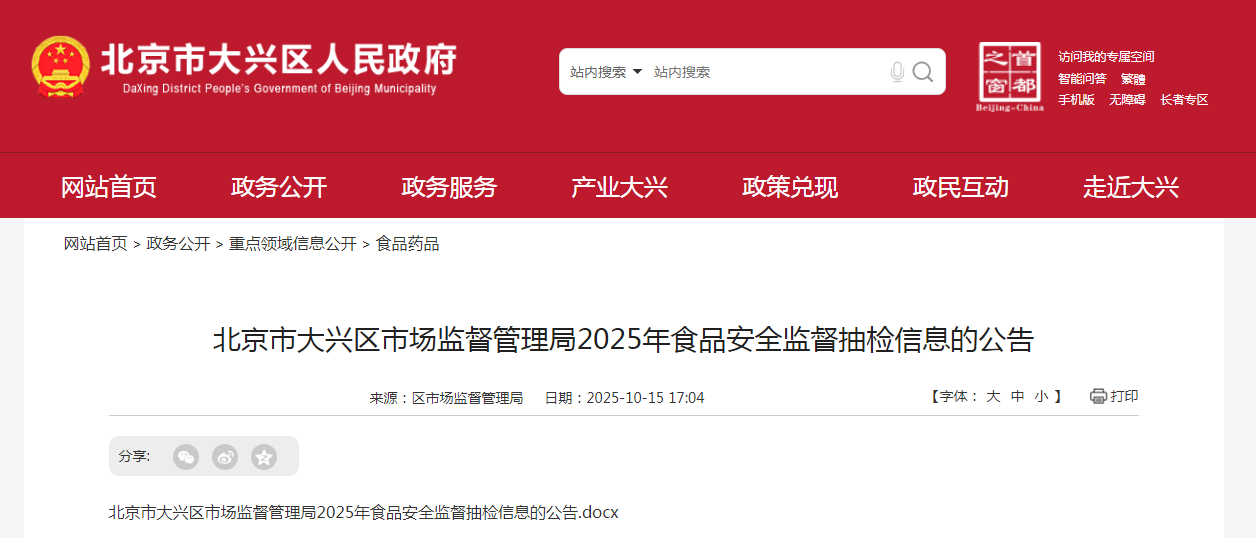 北京市大兴区市场监督管理局2025年食品安全监督抽检信息的公告(2025年第5期)