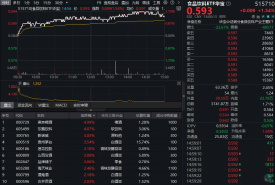 2026年首个交易日(1月5日),吃喝板块迎来开门红!反映吃喝板块整体走势的食品饮料ETF华宝 (515710)开盘后震荡拉升,盘中场内价格最高涨幅达到1.71%,截至收盘,涨1.54%。 成份股方面,白酒龙头集体猛攻。截至收盘,贵州茅台大涨3.54%,山西汾酒涨3.08%,五粮液、泸州 老窖、洋河股份等涨超1%。部分大众品亦涨幅居前,燕京啤酒、东鹏饮料双双收涨超4%。 | | | 分时 多日 1分 5分 15分 30分 · | | | | | | F9 盘前盘后 婴加 九年 图线 工具 (2) > | | | 食品饮料ETF华宝 O | | 515710 | | --- | --- | --- | --- | --- | --- | --- | --- | --- | --- | --- | --- | --- | --- | | 0.50 | | | | | 515710[食品饮料ETF华堂] 14:56 价 0.593 脂颜 0.009(1.54%) 均价 0.591 成交量 1. | | | | | 199 | 0.595 | | +0.009 +1.54% | | | | | | | Company ...