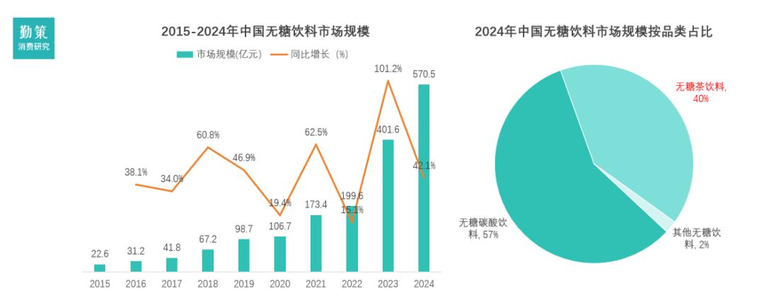 一、中国无糖茶行业现状:健康消费趋势催生市场机遇,行业发展面临挑战 1、 中国无糖茶:市场规模增长,成无糖饮料重要组成 2015-2024年中国无糖饮料市场规模呈持续上升趋势,市场规模由2015年的 22.6亿元 上升至2024年的 570.5亿元 ,十年复合增长率高达 43.2% 。这一趋势 主要 由于各年龄层健康意识提升和甜味剂技术的发展 。 健康意识层面,年轻群体为保持身材,对无糖饮料青睐有加;中老年群体出于预防糖尿病、控制体重等健康考量,也更倾向选择无糖饮品;儿童家长则关 注孩子的糖分摄入,避免龋齿等问题,会为孩子挑选无糖饮料。 2024年中国无糖饮料市场中,无糖茶饮料占据 40% 的市场份额,在无糖饮料品类中占据重要地位。近年来,无糖茶饮料起势逐渐明显,这既源于消费者 对茶饮料天然、健康属性的认可,也和茶饮料企业不断创新,推出契合大众口味与健康需求的产品密切相关。 数据来源:国家统计局、中国饮料工厂协会、灼识咨询、勤策消费研究 2、中国无糖茶销售额增长遇阻,2025年首现负增长 无糖茶销售额在经历了2023年至2024年初的爆炸式增长后,增速逐步放缓,2025年,无糖茶销售额 首次出现负增长 。 无 ...