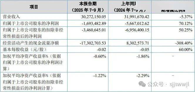 10月27日,"山西运城饲料上市公司"大禹生物发布了三季度报,今年7-9月,大禹生物营业收入3027.22 万元,同比减少5.37%;归母净亏损169.35万元,上年同期净亏损566.7万元,亏损缩窄。 | 项目 | 本报告期 | 上年同 | | | --- | --- | --- | --- | | | (2025年7-9月) | (2024年7-3 ロノ | 用有限口 | | 营业收入 | 30,272,150.05 | 31,991,670.42 | -5.37% | | 归属于上市公司股东的净利润 | -1,693,482.89 | -5,667,012.62 | 70.12% | | 归属于上市公司股东的扣除非经 | -3.460.645.01 | -6,956,400.15 | 50.25% | | 常性损益后的净利润 | | | | | 经营活动产生的现金流量净额 | -17,302,703.53 | 8.302.573.71 | -308.40% | | 基本每股收益(元/股) | -0.02 | -0.05 | 60.00% | | 加权平均净资产收益率%(依据 | -0.60% | -1. ...