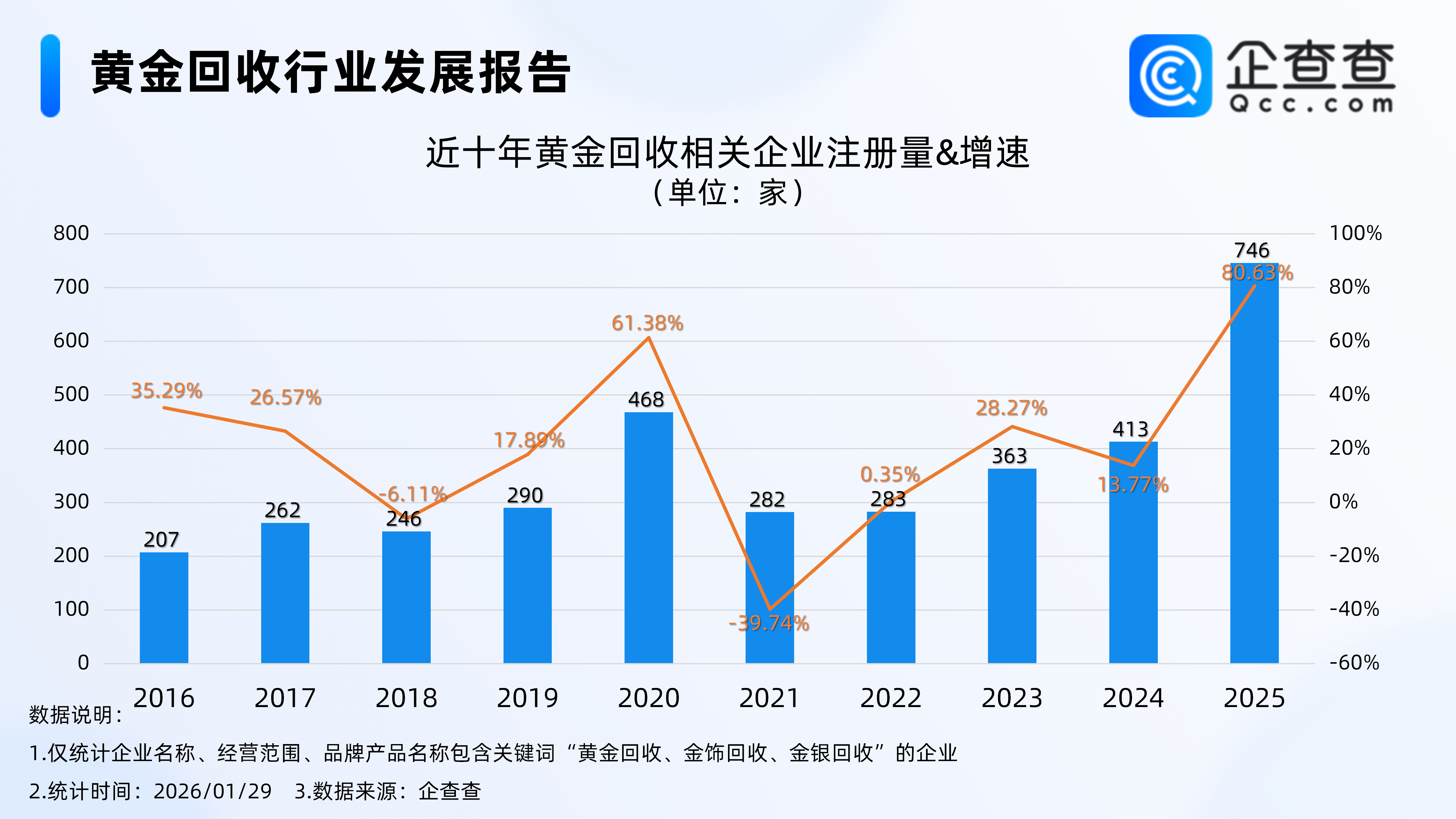 据央视财经报道,最近黄金价格上涨迅猛,不断刷新纪录。在广东深圳水贝市场一家从事黄金回收的门店内,不时有消费者前来出售黄金。有消费者表示, 现在回收价超1100元。工作人员介绍,面对金价飙涨,不少手里有黄金的消费者选择把黄金变现,这让他们的回收量大大增加。黄金回收业务也吸引了二手 交易平台加入。一家专门从事数码产品回收业务的二手交易平台,2025年下半年也开始布局黄金回收业务,他们的黄金回收业务在近期也创下了新高。 黄金回收行 企查查数据显示,截至1月29日,国内现存黄金回收相关企业2913家。近十年相关企业呈整体增长态势,2025年全年注册量同比快速增长80.63%至746家黄 金回收相关企业,创近十年注册量及增速双峰值。截至目前,今年已注册69家相关企业。存量方面,从经营时间来看,成立年限在1年内的黄金回收相关企 业最多,占比25.23%。从地区分布来看,分布在华南地区的黄金回收相关企业最多,占比37.25%。 1.2025年创近十年注册量及增速双峰值 企查查数据显示,截至1月29日,国内现存黄金回收相关企业2913家。近十年相关企业呈整体增长态势,其中2020年全年注册量同比增长61.38%至468家相 ...