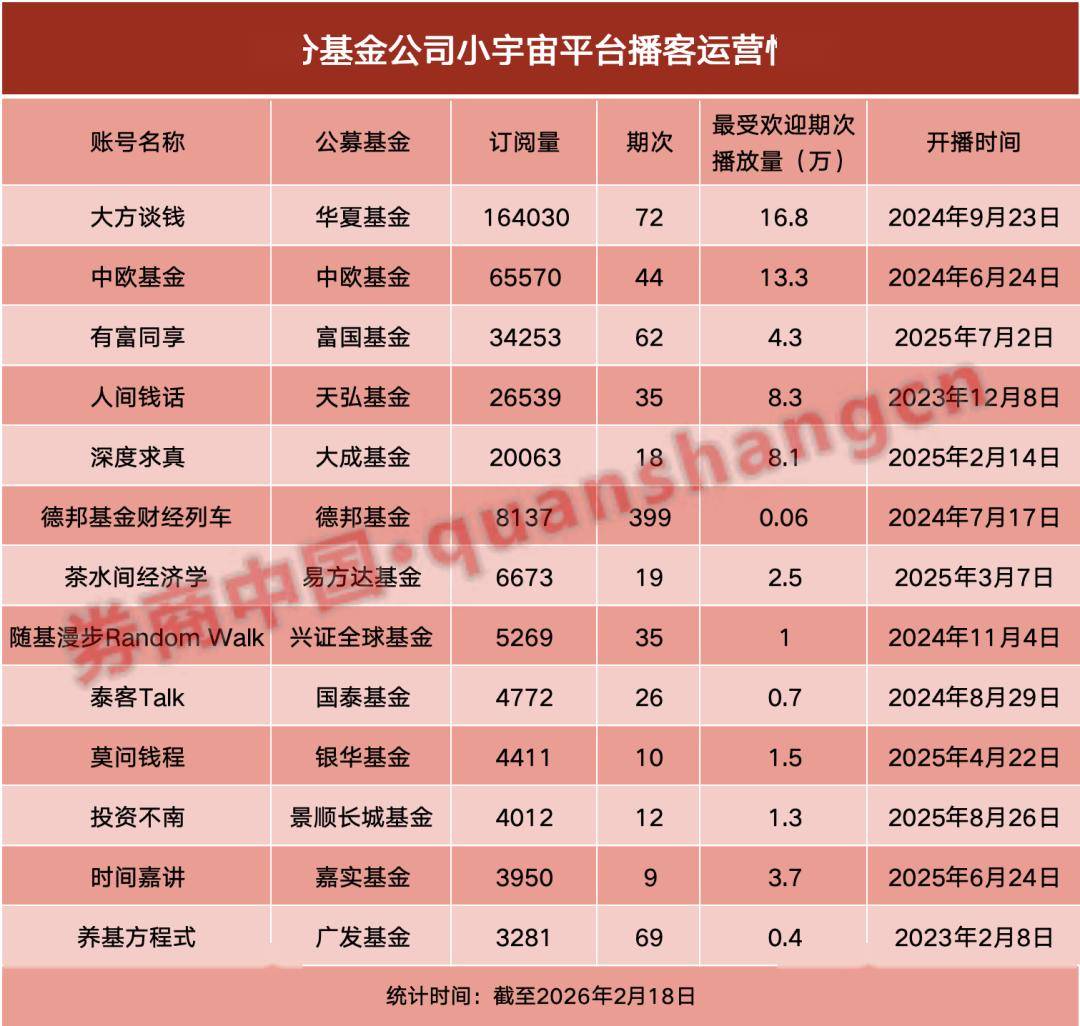 从"尝鲜"到"常态",基金公司集体布局播客,抢占投资者"耳朵阵地"。 2025年以来,多家基金公司相继布局播客——富国基金、大成基金、银华基金、景顺长城基金、嘉实基金、汇添富基金、财通基金等公募密集推出播客栏 目;与此同时,更早入局的华夏基金、中欧基金、天弘基金等机构则保持着常态化更新,华夏基金《大方谈钱》在春节期间仍推出特别节目。从新玩家的 密集入场,到老玩家的稳定运营,播客正在从基金公司的"试水之作"沉淀为投资者服务的常规配置。 春节期间持续"上新" 从更新频率看,部分头部账号已形成稳定运营节奏。华夏基金《大方谈钱》自2024年9月开播以来保持高频更新,春节期间仍推出《新春疗愈:爱自己才 是一切的答案》特别节目。 与此同时,行业分化同样明显,部分早期入局账号已出现断更或仅做内容同步,播客运营的持续性考验基金公司的内容生产能力。 国泰基金旗下《泰客Talk》推出后,收获了大批高认知年轻听众,评论区互动积极。"音频形式能让嘉宾更真实、立体地展现自己,与听众产生真实的情 感交互。"国泰基金认为,这种"去距离感"的呈现,让投资者感受到基金经理作为"人"的真实一面,包括其思考逻辑、市场态度和行业判断。 大成基金20 ...