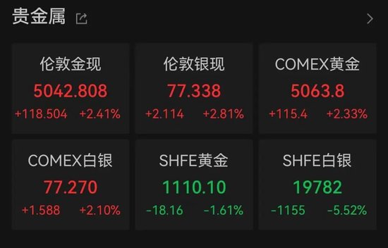 Group 1 - Gold and silver prices rebounded, with spot gold closing at $5042.81 per ounce, up 2.41%, and COMEX gold futures rising 2.33% to $5063.8 per ounce [1][12] - Spot silver increased by 2.81% to $77.34 per ounce, while COMEX silver futures rose 2.10% to $77.27 per ounce [1][12] Group 2 - Following the release of the US CPI data, market expectations for a Federal Reserve interest rate cut increased, leading to a decline in the US dollar index, which supported the attractiveness of precious metals [3][14] - Domestic gold jewelry prices were adjusted upward, with notable increases: Chow Sang Sang's gold jewelry priced at ¥1551 per gram (up ¥27), Lao Miao's at ¥1565 per gram (up ¥36), and Lao Feng Xiang's at ¥1548 per gram (up ¥10) [3][14]