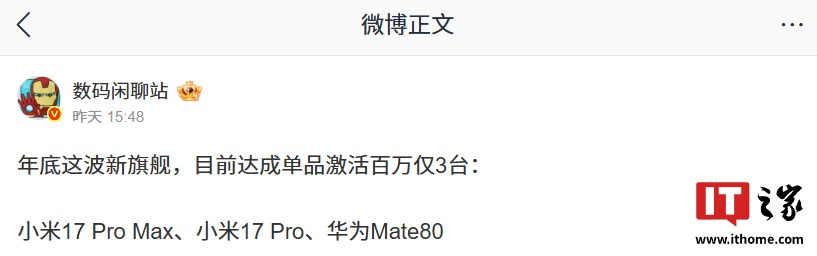 2025 年底新旗舰单品激活百万机型曝光,含小米 17 Pro 系列、华为 Mate 80