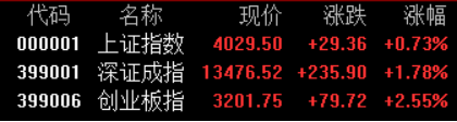 11月13日,A股三大指数今日低开高走,截至收盘,沪指涨0.73%报4029点续创十年新高,深证成指涨 1.78%,创业板指涨2.55%,北证50指数涨2.62%。全市场成交额2.07万亿元,较前一交易日增量1009亿 元,超3900股上涨,逾百股涨停。 | 现价 代码 | 名称 | 涨跌 | 涨幅 | | --- | --- | --- | --- | | 000001 上证指数 4029.50 +29.36 +0.73% | | | | | 399001 深证成指 13476.52 +235.90 +1.78% | | | | | 399006 创业板指 3201.75 +79.72 +2.55% | | | | 盘面上,碳酸锂期货价格持续上涨,锂矿概念、锂电池产业链大爆发,天齐锂业、盛新锂业、雅化集团 等多股涨停;黄金概念板块继续上升,兴业银锡、国成矿业涨停;油气、银行等少数几个板块录得下 跌。 具体来看: 能源金属板块暴涨,永兴材料、天齐锂业、盛新锂能、融捷股份涨停。 基本面上,六氟磷酸锂价格近月持续飙升,截至11月7日突破12.15万元/吨,较9月末涨幅达99%,下游 电解液企业采购加速,推动锂盐需 ...