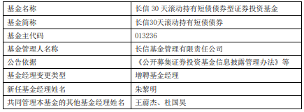 朱黎明曾任中证鹏元资信评估有限公司债券分析师、国联安基金管理有限公司信用研究员。2019年6月 加入长信基金管理有限责任公司,曾任固收研究部研究员,现任基金经理。 长信30天滚动持有短债债券A/C成立于2021年9月9日,截至2025年10月23日,其今年来收益率为 1.31%、1.14%,成立来收益率为13.23%、12.31%,累计净值为1.1323元、1.1231元。 中国经济网北京10月24日讯今日,长信基金公告,长信30天滚动持有短债债券增聘朱黎明。 | 基金名称 | 长信 30天滚动持有短债债券型证券投资基金 | | --- | --- | | 基金简称 | 长信30天滚动持有短债债券 | | 基金主代码 | 013236 | | 基金管理人名称 | 长信基金管理有限责任公司 | | 公告依据 | 《公开募集证券投资基金信息披露管理办法》等 | | 基金经理变更类型 | 增聘基金经理 | | 新任基金经理姓名 | 朱黎明 | | 共同管理本基金的其他基金经理姓名 | 王蔚杰、杜国吴 | ...
