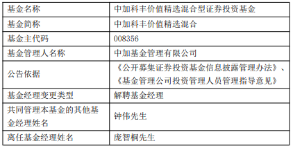 中加邮益一年持有混合A/C成立于2022年1月4日,截至2025年10月23日,其今年来收益率为7.40%、 6.96%,成立来收益率为7.74%、5.71%,累计净值为1.0774元、1.0571元。 | 基金名称 | 中加科丰价值精选混合型证券投资基金 | | --- | --- | | 基金简称 | 中加科丰价值精选混合 | | 基金主代码 | 008356 | | 基金管理人名称 | 中加基金管理有限公司 | | 公告依据 | 《公开募集证券投资基金信息披露管理办法》 《基金管理公司投资管理人员管理指导意见》 | | 基金经理变更类型 | 解聘基金经理 | | 共同管理本基金的其他基 | 钟伟先生 | | 金经理姓名 | | | 离任基金经理姓名 | 庞智桐先生 | 中国经济网北京10月24日讯 昨日,中加基金公告,庞智桐离任中加科丰价值精选混合、中加心享混 合、中加邮益一年持有混合。 中加科丰价值精选混合成立于2020年5月8日,截至2025年10月23日,其今年来收益率为2.89%,成立来 收益率为32.66%,累计净值为1.3144元。 中加心享混合A/C成立于2015年12月2日和2016年3 ...