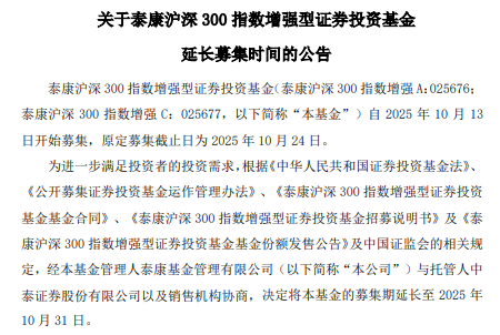 中国经济网北京10月24日讯今日,泰康基金发布关于泰康沪深300指数增强型证券投资基金延长募集时 间的公告。 公告称,泰康沪深300指数增强型证券投资基金(泰康沪深300指数增强A:025676;泰康沪深300指数增 强C:025677,)自2025年10月13日开始募集,原定募集截止日为2025年10月24日,现决定将该基金的募 集期延长至2025年10月31日。 该基金拟任基金经理袁帅2018年6月加入泰康公募,现任泰康基金量化基金经理。2024年6月7日起至今 担任泰康中证港股通大消费主题指数型发起式证券投资基金经理。2024年6月7日起至今担任泰康港股通 中证香港银行投资指数型发起式证券投资基金经理。2025年2月7日起至今担任泰康中证500指数增强型 发起式证券投资基金经理。2025年2月7日起至今担任泰康中证1000指数增强型发起式证券投资基金经 理。2025年2月7日起至今担任泰康半导体量化选股股票型发起式证券投资基金经理。2025年6月30日至 今担任泰康上证科创板综合指数增强型证券投资基金经理。 ...
