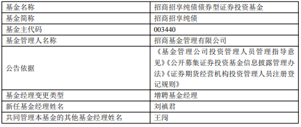 中国经济网北京10月24日讯今日,招商基金公告,招商招享纯债增聘刘禛君。 招商招享纯债A/C成立于2017年3月17日,招商招享纯债D成立于2024年3月14日,截至2025年10月23 日,其今年来收益率为-2.35%、-2.56%、-2.47%,成立来收益率为33.58%、2.98%、7.35%,累计净值为 1.2928元、1.0297元、1.0750元。 | 基金名称 | 招商招享纯债债券型证券投资基金 | | --- | --- | | 基金简称 | 招商招享纯债 | | 基金主代码 | 003440 | | 基金管理人名称 | 招商基金管理有限公司 | | 公告依据 | 《基金管理公司投资管理人员管理指导意 | | | 见》《公开募集证券投资基金信息披露管理办 | | | 法》《证券期货经营机构投资管理人员注册登 | | | 记规则》 | | 基金经理变更类型 | 增暗重令经西 | | 新任基金经理姓名 | 刘祺君 | | 共同管理本基金的其他基金经理姓名 | 王国 | 刘禛君2014年12月至2019年5月在招商财富资产管理有限公司工作,任基金会计,从事交易结算和估值 核算工作;2019年5月加入 ...
