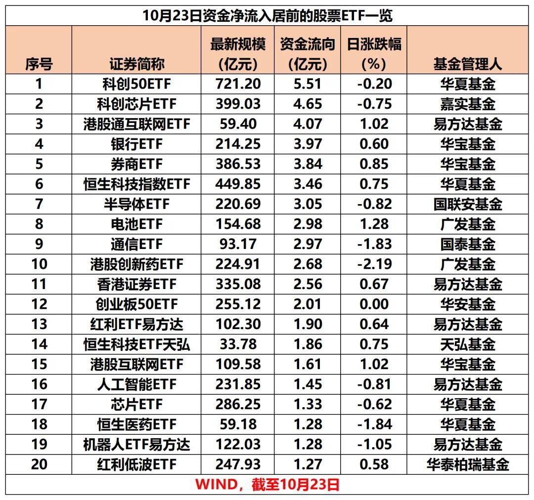 Group 1 - The core viewpoint of the articles indicates that on October 23, the A-share market saw all three major indices close in the green, with significant inflows into stock ETFs, totaling 33.6 billion yuan [2][4][8] - The top five sectors with net inflows included semiconductors (11.8 billion yuan), gold (9.3 billion yuan), Hang Seng Technology (8.2 billion yuan), Sci-Tech 50 Index (7.9 billion yuan), and pharmaceuticals (7.9 billion yuan) [2][3] - Conversely, the sectors with the largest net outflows were the CSI 300 Index (-13.3 billion yuan), coal (-6.0 billion yuan), CSI 500 Index (-6.0 billion yuan), CSI A500 Index (-4.8 billion yuan), and CSI 1000 Index (-3.3 billion yuan) [2][6] Group 2 - E Fund's ETF saw a recent scale increase to 811.3 billion yuan, with a net inflow of 13.6 billion yuan on October 23, and a total increase of 210.65 billion yuan since 2025 [2][3] - The Hong Kong Stock Connect Internet ETF from E Fund recorded a net inflow of 4.1 billion yuan, reaching a historical high in scale [2][3] - The top inflow ETFs included Sci-Tech 50 ETF (5.51 billion yuan), Sci-Tech Chip ETF (4.65 billion yuan), and Hong Kong Stock Connect Internet ETF (4.07 billion yuan) [5][6] Group 3 - The articles highlight that popular thematic ETFs related to chips, banks, and brokerages have become the main "money magnets" [4][6] - The outflow of funds from broad-based ETFs such as the CSI 300 ETF, CSI 500 ETF, and A500 Index ETF indicates a trend of "blood loss" in these products [6][7] - The market outlook suggests that despite ongoing volatility, sectors like AI, non-ferrous metals, Hong Kong internet stocks, and new energy are seen as good investment opportunities [8]