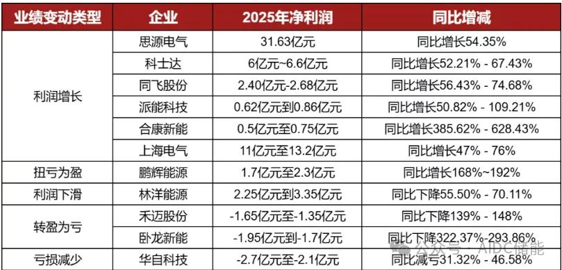 近日,国内著名10+储能领域相关企业发布了2025年业绩预告,超过六成企业实现了利润增长。 海外市场已是关键胜负手,派能科技、鹏辉能源、科士达等企业业绩实现增长,共同点是海外市场,尤其是户用和 工商业储能领域贡献显著。 林洋能源、禾迈股份等业绩承压,更多受制于国内市场的激烈价格战和成本压力。华自科技也明确提及国内市场竞 争加剧导致行业性价格内卷、毛利率水平不高。 林洋能源、禾迈股份等业绩承压,更多受制于国内市场的激烈价格战和成本压力。华自科技也明确提及国内市场竞 争加剧导致行业性价格内卷、毛利率水平不高。 同时,产业链利润正在向上游核心部件与下游运营集中。温控领域同飞股份的利润高增,以及电芯代表鹏辉能源的 扭亏,证明具备技术壁垒的核心部件环节在产业链中议价能力恢复。而下游系统集成环节则因直接承受价格战,利 润空间受到挤压。 整体来看,面对行业竞争加剧与原材料价格波动等挑战,技术路线优化、加强成本管控、聚焦细分市场与拓展新兴 场景,将成为企业提升竞争力的关键。 近日,国内著名10+储能领域相关企业发布了2025年业绩预告,超过六成企业实现了利润增长。 | 业绩变动类型 | they | 2025年净利润 | 同 ...