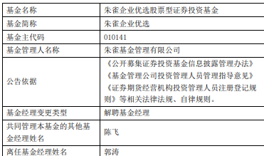 中国经济网北京2月24日讯 近日,朱雀基金公告,郭涛离任朱雀企业优选,陈飞管理。 陈飞曾就职于上海光大证券资产管理有限公司。2020年8月加入朱雀基金管理有限公司,现任朱雀 基金公募投资部投资副总监。 朱雀企业优选A/C成立于2020年09月23日,截至2026年02月13日,其今年来收益率为4.73%、 4.63%,成立来收益率为6.42%、1.92%,累计净值为1.0642元、1.0192元。 | 基金名称 | 朱雀企业优选股票型证券投资基金 | | --- | --- | | 基金简称 | 朱雀企业优选 | | 基金主代码 | 010141 | | 基金管理人名称 | 朱雀基金管理有限公司 | | 公告依据 | 《公开募集证券投资基金信息披露管理办法》 | | | 《基金管理公司投资管理人员管理指导意见》 | | | 《证券期货经营机构投资管理人员注册登记规 | | | 则》等相关法律法规、自律规则。 | | 基金经理变更类型 | 解聘基金经理 | | 共同管理本基金的其他基 | 陈飞 | | 金经理姓名 | | | 离任基金经理姓名 | 郭涛 | (责任编辑:康博) ...