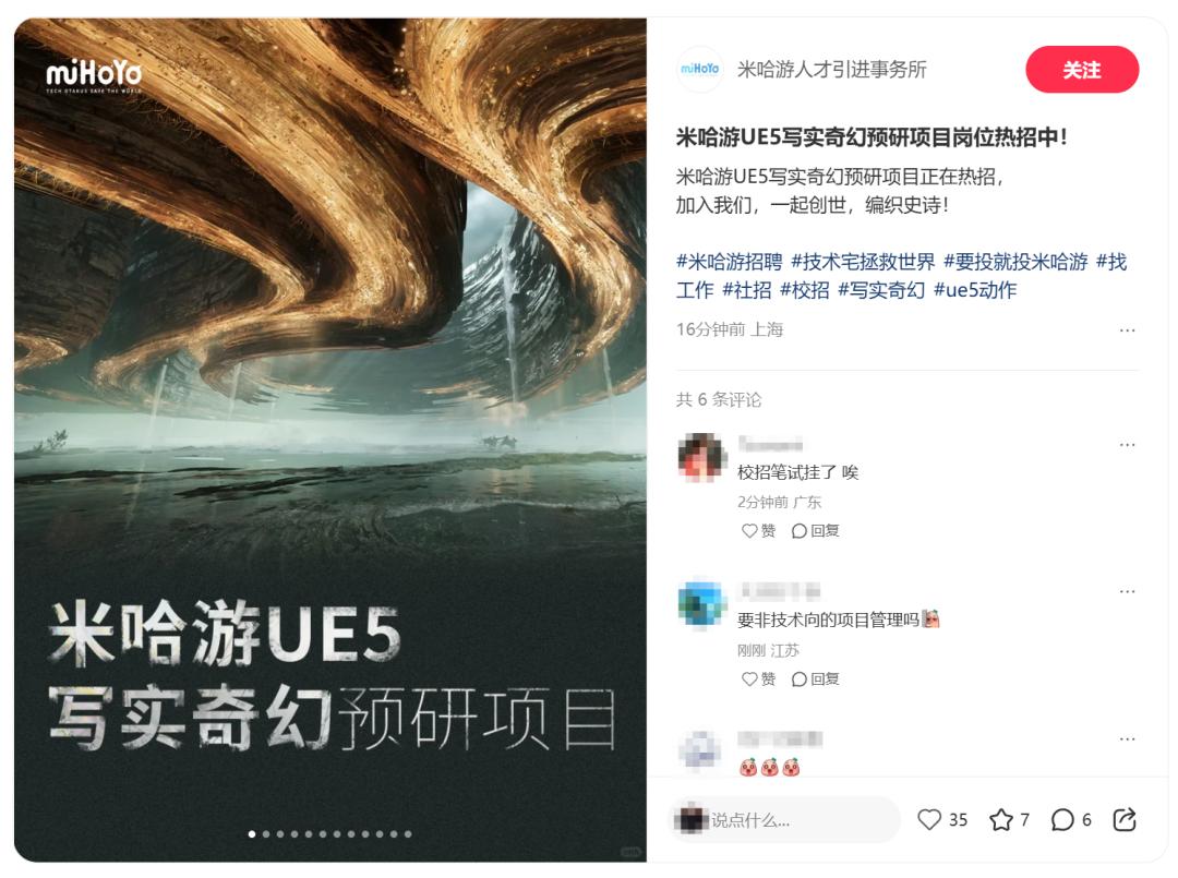 Core Insights - MiHoYo has launched a new recruitment campaign for 63 positions related to its upcoming UE5 realistic fantasy project, marking the first public appearance of this product since the announcement of five mysterious new games last September [1][3]. Group 1: Game Development and Features - The new project is characterized as a "fantasy epic world" with significant elements such as "large-scale boss battles," suggesting a gameplay style reminiscent of the "God of War" series [3]. - The game will incorporate AIGC technology, featuring "ecological AI simulation" and "full-terrain combat AI," indicating MiHoYo's advancements in integrating AI into gaming [5]. - The game world will include themes of ancient mysteries, evil beasts, and legendary heroes, emphasizing a strong "Western fantasy" flavor in its narrative [5][10]. Group 2: Recruitment and Talent Needs - The recruitment covers four main functional categories: planning, art, programming, and comprehensive roles, with a focus on "extremely high quality" and "super high sensitivity" in talent requirements [7]. - The job descriptions highlight the need for skills related to "character abilities," "impact feel," and "large-scale synchronized monster simulation," indicating a strong emphasis on action combat mechanics [10]. - This recruitment effort suggests that MiHoYo is accelerating its transition from a "2D-focused company" to a "comprehensive game developer," aiming to leverage advanced technologies like UE5 and AI for its next major release [10].