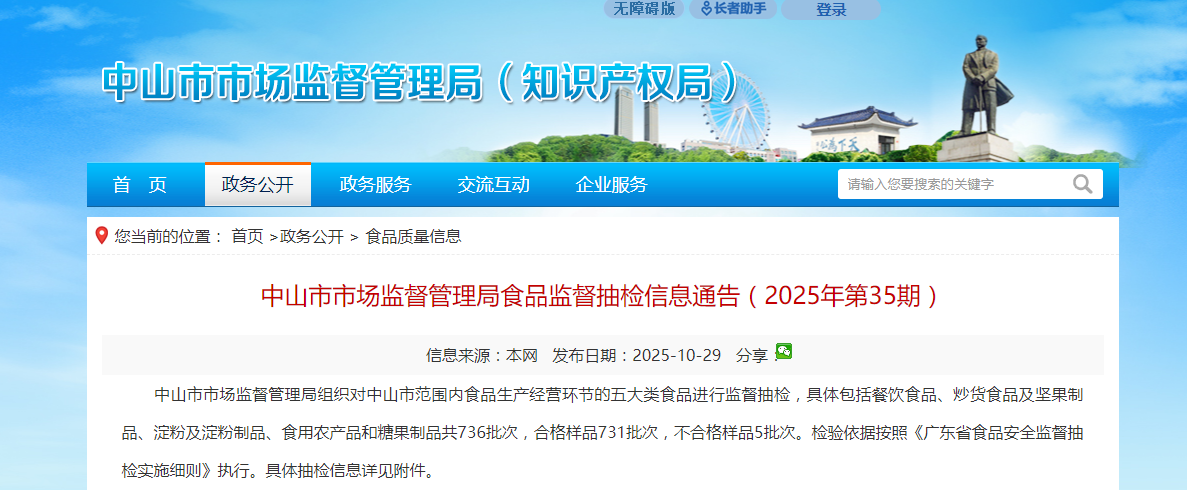 广东省中山市市场监督管理局食品监督抽检信息通告(2025年第35期)
