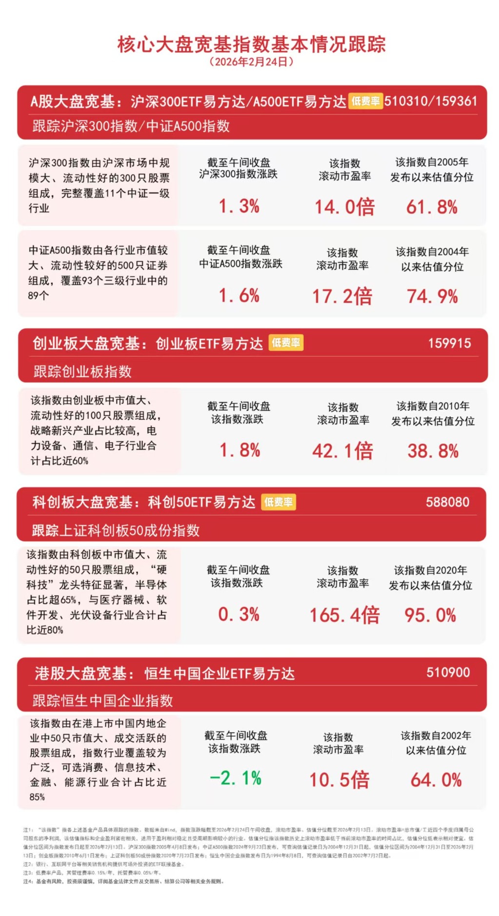 2月24日早盘,A股三大指数早盘集体上涨,沪指半日涨1.17%,沪深京三市半日成交额15210亿元,较前一交易日半天放量3074亿元。全市场超 4200只个股上涨。板块题材上,油气开采及服务、贵金属、光纤概念、磷化工、化学原料、电网设备、煤炭开采加工、CPO、港口航运板块涨幅 居前;影视院线、AI应用、云计算、旅游及酒店、保险、白酒板块跌幅居前;港股低开低走,科技、医药股跌幅居前。 截至午间收盘,中证A500指数上涨1.6%,沪深300指数上涨1.3%,创业板指数上涨1.8%,上证科创板50成份指数上涨0.3%,恒生中国企业指数下 跌2.1%。 | 沪深300指数由沪深市场中规 | 截至午间收盘 | 该指数 | 该指数自2005年 | | --- | --- | --- | --- | | 模大、流动性好的300只股票 | 沪深300指数涨跌 | 滚动市盈率 | 发布以来估值分位 | | 组成,完整覆盖11个中证一级 行业 | 1.3% | 14.0倍 | 61. 8% | | 中证A500指数由各行业市值较 | 截至午间收盘 | 该指数 | 该指数自2004年 | | 大、流动性较好的500只证券 | 中证 ...
