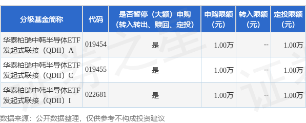 以上内容为证券之星据公开信息整理,由AI算法生成(网信算备310104345710301240019号),不构成 投资建议。 证券之星消息,10月23日华泰柏瑞基金管理有限公司发布《华泰柏瑞中证韩交所中韩半导体交易型开放 式指数证券投资基金发起式联接基金(QDII)调整大额申购(含定期定额投资)业务的公告》。公告 中提示,为保证本基金的稳定运作,保护基金份额持有人利益,以及根据《华泰柏瑞中证韩交所中韩半 导体交易型开放式指数证券投资基金发起式联接基金(QDII)基金合同》的相关规定,自2025年10月 23日起华泰柏瑞中证韩交所中韩半导体交易型开放式指数证券投资基金发起式联接基金(QDII)调整 大额申购(含定期定额投资)业务,申购上限金额为1.0万元,下属分级基金调整明细如下: | 分级基金简称 | 代码 | 是否暂停(大额)申购 (转入转出、赎回、定投) | 申购限额 转入限额 (元) | (元) | 定投限额 (元) | | --- | --- | --- | --- | --- | --- | | 华泰柏瑞中韩半导体ETF 发起式联接(QDII) A | 019454 | 를 | 1.00万 | | ...