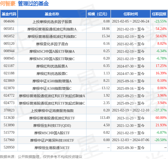 | 基金代码 | 基金名称 | 规模(亿元) | 任职时间 | 任职回报 | | --- | --- | --- | --- | --- | | 004606 | 上投摩根优选多因子股票 | 0.08 | 2021-02-05 ~ 2022-06-24 | -23.55% | | 005051 | 摩根标普港股通低波红利指数A | 18.06 | 2021-02-19 ~ 至今 | 54.24% | | 005052 | 摩根标普港股通低波红利指数C | 15.34 | 2021-02-19~至今 | 50.63% | | 005120 | 摩根量化多因子混合 | 0.16 | 2021-02-05~至今 | 8.02% | | 008944 | 摩根MSCI中国A股ETF联接A | 0.25 | 2021-02-19~至今 | -6.34% | | 008945 | 摩根MSCI中国A股ETF联接C | 0.20 | 2021-02-19~至今 | -6.78% | | 021187 | 摩根红利优选股票A | 0.35 | 2024-07-30~至今 | 17.25% | | 021188 | 摩根红利优 ...