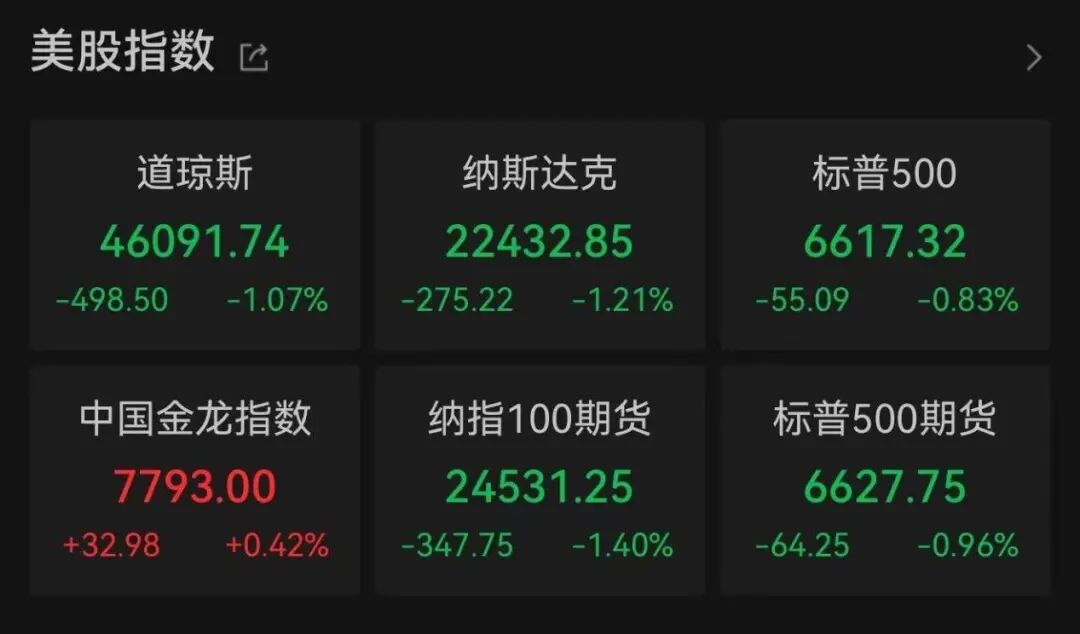 【导读】纳指和道指跌幅超1%,亚马逊跌超4% 中国基金报记者 储是 对美股科技股泡沫和美国经济前景的担忧引发美股齐跌。同时,美联储降息预期降温,股票 市场承压。市场密切关注英伟达财报;拼多多业绩增速放缓,股价跌超7%。 三大指数深夜齐跌 美东时间11月18日(周二),市场对科技股估值过高的担忧情绪继续发酵,美股三大指数集 体收跌,纳指和道指跌幅均超过1%。 截至收盘,道琼斯指数下跌1.07%,报46,091.74点;标普500指数下跌0.83%,报 6,617.32点;纳斯达克指数下跌1.21%,报22,432.85点。 | 美股指数 它 | | | | --- | --- | --- | | 道琼斯 | 纳斯达克 | 标普500 | | 46091.74 | 22432.85 | 6617.32 | | -498.50 -1.07% | -275.22 -1.21% | -55.09 -0.83% | | 中国金龙指数 | 纳指100期货 | 标普500期货 | | 7793.00 | 24531.25 | 6627.75 | | +32.98 +0.42% | -347.75 -1.40% | -64.2 ...