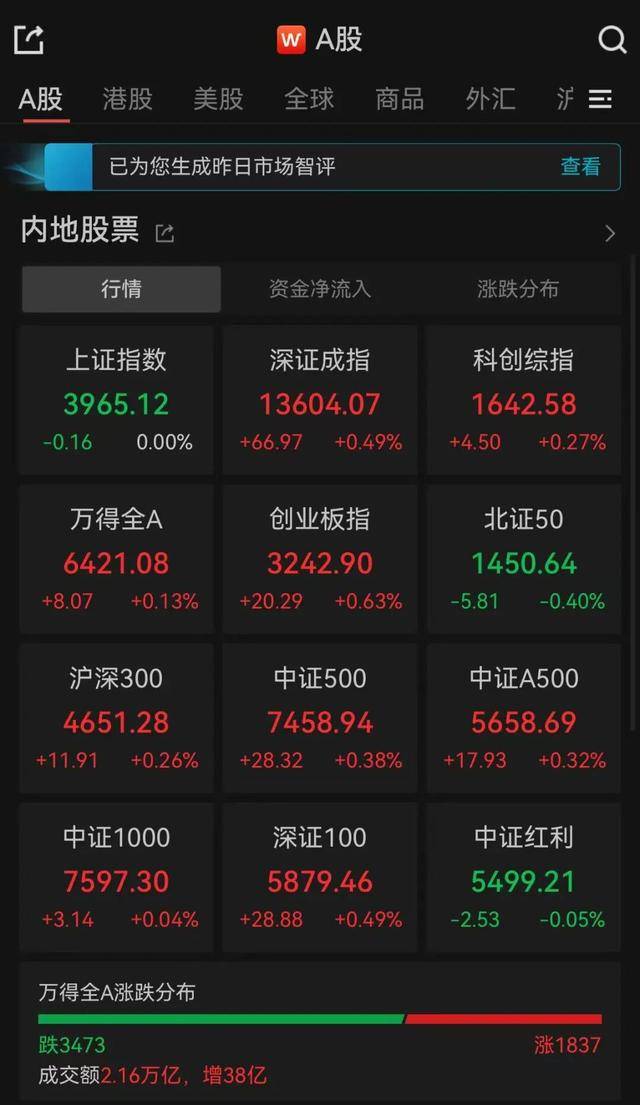 30日,A股三大指数早盘低开,盘中均震荡上行多次翻红。Wind数据显示,截至收盘,上证指数微跌, 报3965.12点;深证成指涨0.49%,创业板指涨0.63%。 板块方面,人形机器人概念股午后爆发,数字货币、AI手机、短剧游戏题材表现活跃。光伏产业链回 撤,海南自贸区、离境退税、商业航天概念股出现调整。 全市交易额2.16万亿,逾3400只个股下跌。 | 14 | | w A股 | | | Q | | --- | --- | --- | --- | --- | --- | | A股 | 港股 美股 | 全球 | 商品 | 汁 三 外汇 | | | 已为您生成昨日市场智评 | | | | 查看 | | | 内地股票 它 | | | | | | | 行情 | | 资金净流入 | | 涨跌分布 | | | 上证指数 | | 深证成指 | | 科创综指 | | | 3965.12 | | 13604.07 | | 1642.58 | | | -0.16 0.00% | | +66.97 +0.49% | | +4.50 +0.27% | | | 万得全A | | 创业板指 | | 北证50 | | | 6421.0 ...