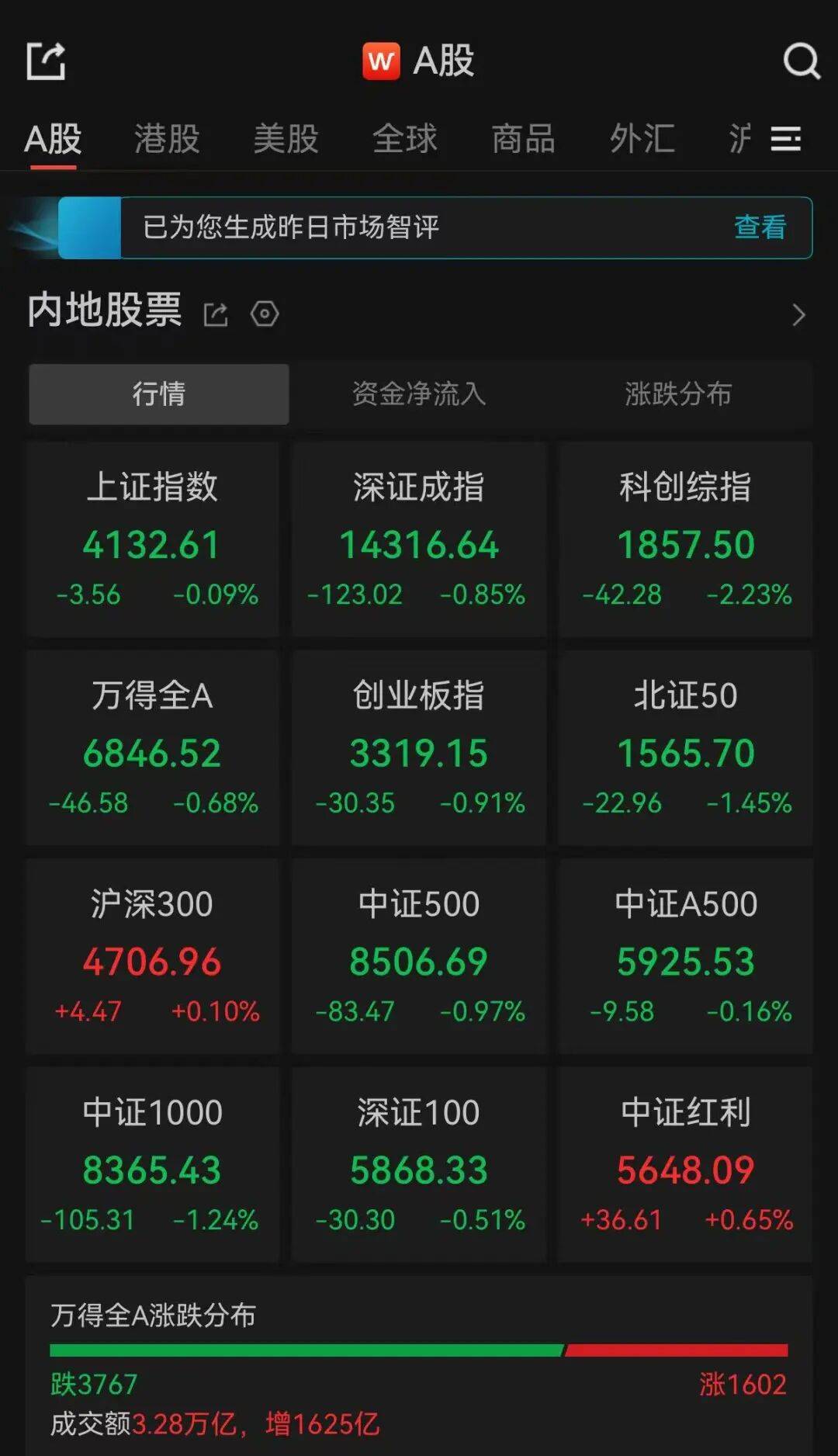 新闻荐读 板块方面,贵金属再度爆发,带动有色金属概念股集体走强,化工等方向同样涨幅居前;AI应用概念股局部发力,浙文互联盘中涨停,浙数文化、盛天 网络、天舟文化等直线拉升;午后油气股持续走高,中曼石油盘中涨停,通源石油、中国海油、中国石油、中国石化、潜能恒信跟涨;生物医药概念午后 快速拉升。商业航天概念持续走弱,中国卫通、中国卫星等多股跌停;半导体设备概念震荡走弱,白酒板块震荡下挫,军工、卫星等方向跌幅居前。 26日,A股三大指数集体高开,随后震荡下行,集体收跌。截至收盘,沪指跌0.09%,深证成指跌0.85%,创业板指跌0.91%。全市成交额3.28万亿,超 3700只个股下跌。 | L | w A股 | | | Q | | --- | --- | --- | --- | --- | | A股 港股 美股 | 全球 | 商品 | 汁 三 外汇 | | | 已为您生成昨日市场智评 | | | 查看 | | | 内地股票 它 ○ | | | | | | 行情 | 资金净流入 | | 涨跌分布 | | | 上证指数 | 深证成指 | | 科创综指 | | | 4132.61 | 14316.64 | | 1857 ...