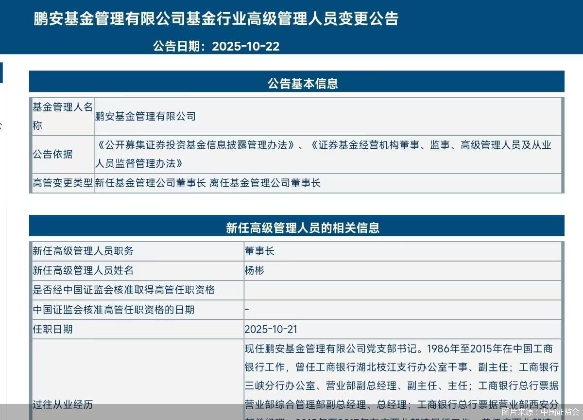 北京商报讯(记者 郝彦)10月22日,鹏安基金发布公告表示,董事长张国勇因退休于10月21日离任,杨彬同日起任董事长。 | 基金管理人名 标 | | --- | | 《公开募集证券投资基金信息披露管理办法》、《证券基金经营机构董事、监事、高级管理人员及, 公告依据 | | 人员监督管理办法》 | | 高管变更类型新任基金管理公司董事长 离任基金管理公司董事长 | | | 新任高级管理人员的相关信息 | | --- | --- | | 新任高级管理人员职务 | 革事长 | | 新任高级管理人员姓名 | 杨彬 | | 是否经中国证监会核准取得高管任职资格 | | | 中国证监会核准高管任职资格的日期 | | | 任职日期 | 2025-10-21 | | | 现任鹏安基金管理有限公司党支部书记。1986年至2015年在中国 | | | 银行工作,曾任工商银行湖北枝江支行办公室干事、副主任;工禄 | | | 三峡分行办公室、营业部副总经理、副主任、主任;工商银行总行 | | 过往从业经历 | 营业部综合管理部副总经理、总经理;工商银行总行票据营业部强 | 公开简历显示,杨彬现任鹏安基金党支部书记。1986年至201 ...
