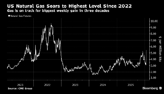 Group 1 - The core viewpoint of the articles highlights a significant surge in U.S. natural gas futures prices, reaching the highest level since 2022, driven by expectations of severe cold weather impacting supply and demand dynamics [1][2] - The National Oceanic and Atmospheric Administration (NOAA) forecasts indicate that two-thirds of the U.S. is likely to experience below-normal temperatures, contributing to heightened demand for natural gas [1] - The near-month natural gas contract saw a dramatic increase of 13% on Thursday, reaching $5.502 per million British thermal units, with a cumulative rise of over 50% in the previous two trading days, potentially marking the largest weekly gain in 34 years [1] Group 2 - Concerns are growing that extreme low temperatures may lead to "freezing" in the southern U.S., where moisture in pipelines could solidify and disrupt natural gas production, resulting in involuntary declines in output [2] - As cold weather intensifies, natural gas consumption is expected to rise significantly, accelerating inventory depletion [2] - The price surge in the U.S. market is affecting global energy dynamics, particularly impacting Europe and Asia, which heavily rely on U.S. liquefied natural gas (LNG) exports [2] - European natural gas futures prices have surged over 18% in the past week due to increased demand from low temperatures, while Japan's electricity prices reached a three-month high, indicating widespread supply tightness and upward price pressure in the global energy market [2]