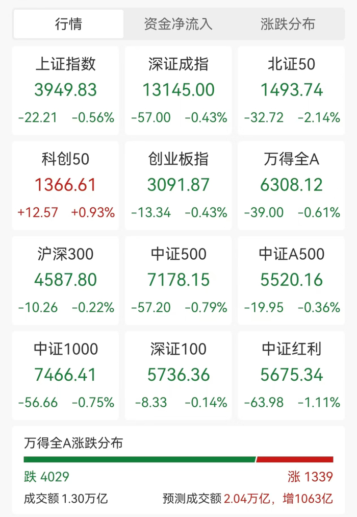 编辑丨江佩霞 记者丨刘雪莹 易妍君 11月18日,A股指数震荡调整,深成指、创业板指翻红后回落,市场超4000股下跌。 | 行情 | 资金净流入 涨跌分布 | | --- | --- | | 上证指数 | 北证50 深证成指 | | 3949.83 | 13145.00 1493.74 | | -22.21 -0.56% -57.00 -0.43% -32.72 -2.14% | | | 科创50 | 创业板指 万得全A | | 1366.61 | 3091.87 6308.12 | | +12.57 +0.93% -13.34 -0.43% -39.00 -0.61% | | | 沪深300 | 中证500 中证A500 | | 4587.80 | 7178.15 5520.16 | | -10.26 -0.22% -57.20 -0.79% -19.95 -0.36% | | | 中证1000 | 中证红利 深证100 | | 7466.41 | 5736.36 5675.34 | | -56.66 -0.75% | -8.33 -0.14% -63.98 -1.11% | | 万得全A涨跌分布 | | ...