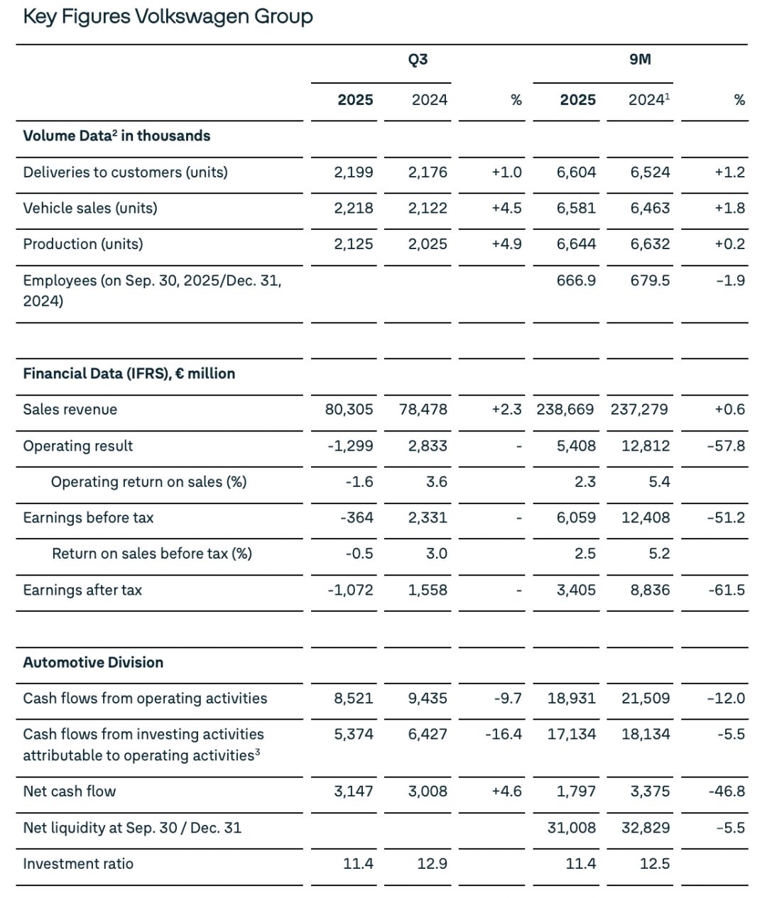 每经编辑|张锦河 当地时间10月30日,德国大众集团发布的三季度数据显示,大众集团2025年三季度净利润为负10.72亿欧元,前三季度净利润与上年同期相比大幅下降 61.5%至34亿欧元。 此外,保时捷内部裁员等组织重组以及取消独立的电池领域业务投资,也带来了10亿欧元的额外支出。仅前三季度,保时捷因重组产生的特殊支出已达27 亿欧元,预计2025财年与战略重组相关的总成本将达到约31亿欧元。 2025年第三季度,大众汽车集团共交付汽车219.9万辆,同比增长1.0%。从区域市场来看,表现各有不同。西欧、中欧和东欧以及南美洲市场处于增长态 势,北美洲市场销量则同比下滑9.8%,为24.69万辆。 中国作为大众汽车的重要市场,第三季度销量为66.03万辆,同比下滑7.2%。随着中国自主品牌车企在新能源汽车领域凭借性价比优势、先进的电池技术 和智能化配置迅速崛起,大众汽车在产品价格、智能化水平等方面的优势不再明显,市场份额逐步被挤压。 | | | Q3 | | | 9M | | | --- | --- | --- | --- | --- | --- | --- | | | 2025 | 2024 | % | 20 ...