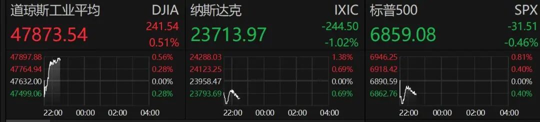 晚间,美股低开后表现分化,纳指小幅跳水跌超1%。国际金价拉升走高。 据报道,贝森特表示,美联储主席第二轮面试即将开始,可以想象在圣诞节前选出美联储主席候选人。赞赏美联储降息25个基点,但不喜欢其措辞。 当地时间10月29日,美联储宣布降息25个基点。美联储主席杰罗姆·鲍威尔当日在新闻发布会上表示,美联储将继续根据最新数据、不断变化的经济前景 以及风险平衡来确定适当的货币政策立场。 纳斯达克中国金龙指数走低,截至发稿,下跌1.7%。个股方面,百度集团跌超4%,理想汽车、阿里巴巴跌逾2%。 在昨日下跌后,10月30日国际金价出现拉升走高,截至发稿,现货黄金涨超2%,再度站上4000美元/盎司关口,现货白银也涨超2%。 10月30日,美股三大指数集体低开,道琼斯指数跌0.41%,标普500指数跌0.52%,纳斯达克综合指数跌0.79%。截至发稿,道指转为上涨,纳指跌超1%。 | 道琼斯工业平均 | | | DJIA | 纳斯达克 | | | | IXIC 标普500 | | | | | SPX | | --- | --- | --- | --- | --- | --- | --- | --- | --- | --- ...