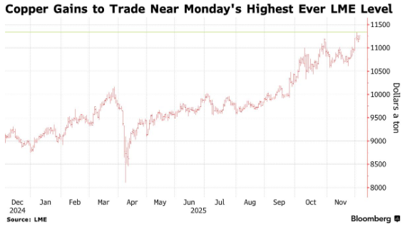 智通财经APP获悉,全球供应担忧支撑了投资者对铜的需求,这种对绿色转型至关重要的金属在接近本 周稍早创下的纪录高位附近交投。 周一创下历史新高后铜价有所回落,但已与其他工业金属一同反弹。近几周的上涨主要是由于市场猜 测,随着贸易商将大量铜转运至美国以规避可能的进口关税,供应短缺或已迫在眉睫。 今年全年,从印度尼西亚到智利和刚果民主共和国的一系列计划外矿山停产事件主导了铜市场的供应问 题。中国冶炼厂和矿商正在进行2026年的供应谈判,由于矿商在谈判中占据上风,谈判进展艰难。 投资者还在等待本周将公布的一系列美国数据,包括周三晚些时候将公布的私营部门就业、进口价格和 工业产出报告。 截至发稿,铜价上涨1.3%,至每吨11,332美元,今年累计涨幅约28%。铝价上涨1%,锌价上涨0.7%, 而新加坡交易所的铁矿石期货上涨0.2%。 ...