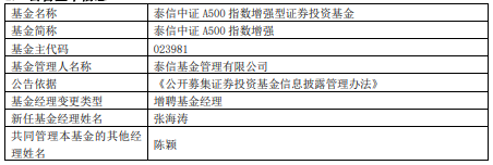 泰信中证A500指数增强A/C成立于2025年9月23日。 | 基金名称 | 泰信中证 A500 指数增强型证券投资基金 | | --- | --- | | 基金简称 | 泰信中证 A500 指数增强 | | 基金主代码 | 023981 | | 基金管理人名称 | 泰信基金管理有限公司 | | 公告依据 | 《公开募集证券投资基金信息披露管理办法》 | | 基金经理变更类型 | 增聘基金经理 | | 新任基金经理姓名 | 张海涛 | | 共同管理本基金的其他经 | 陈颖 | | 理姓名 | | 中国经济网北京10月21日讯今日,泰信基金公告,泰信中证A500指数增强增聘张海涛。 张海涛曾任华夏基金管理有限公司资产配置部研究员,北京源峰私募基金管理合伙企业(有限合伙)研究 部研究员。2024年9月加入泰信基金管理有限公司,曾任基金经理助理兼研究员,2025年1月起任基金经 理。 ...