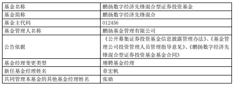 中国经济网北京10月21日讯 今日,鹏扬基金公告,鹏扬数字经济先锋混合增聘章宏帆。 (责任编辑:康博) 章宏帆曾任浙商财产保险股份有限公司资产管理部研究员,敦和资产管理有限公司股票投资部研究 员。现就职于鹏扬基金管理有限公司权益研究部。 鹏扬数字经济先锋混合A/C成立于2021年9月7日,截至2025年10月20日,其今年来收益率为 46.24%、45.29%,成立来收益率为-6.32%、-9.38%,累计净值为0.9368元、0.9062元。 | 基金名称 | 鹏扬数字经济先锋混合型证券投资基金 | | --- | --- | | 基金简称 | 鹏扬数字经济先锋混合 | | 基金主代码 | 012456 | | 基金管理人名称 | 鹏扬基金管理有限公司 | | 公告依据 | 《公开募集证券投资基金信息披露管理办法》、《基金管 理公司投资管理人员管理指导意见》、《鹏扬数字经济先 | | | 径混合型证券投资基金基金合同》 | | 基金经理变更类型 | 增聘基金经理 | | 新任基金经理姓名 | 重宏帆 | | 其同管理本基金的其他基金经理姓名 | 张勋 | ...