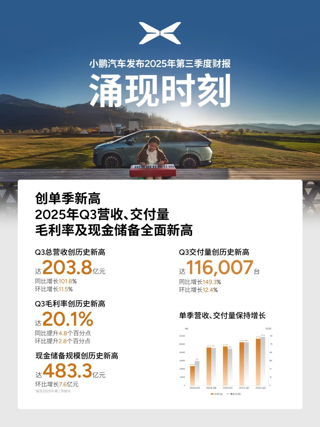 小鹏汽车再次交出了一份史上最强的季度财报:毛利率首次突破20%,超越了特斯拉和比亚迪;营收翻倍,亏损大幅收窄。凭借MONA M03 的持续热销和G6等新车型的出色表现,小鹏终于走出了增长乏力的阴霾。但刚站上盈利门口前的小鹏,不仅要证明自己能持续赚钱,还要在 技术投入和商业回报之间找到平衡。在彻底跑赢这场淘汰赛之前,小鹏要闯的难关,比想象中更多。 毛利率首破20% 11月17日晚,小鹏汽车交出了三季度成绩单:公司总营收达到203.8亿元,同比大幅增长102%,创下历史新高。 更值得关注的是公司盈利能力的改善。三季度小鹏净亏损收窄至3.8亿元,较去年同期的18.1亿元,大幅减少79.01%,毛利率达到20.1%,同比提升4.8个百 分点,这是小鹏汽车综合毛利率首次突破20%大关。 ▲小鹏汽车2025年第三季度财报。图 / 小鹏汽车官方 这意味着,小鹏三季度的毛利率表现赶超了特斯拉(18%)和比亚迪(17.6%)。这背后,与其有效的成本控制和技术研发的相关收入有关,也反映了小 鹏通过技术授权等非整车销售业务获取高利润的模式,有一定成效。 小鹏在财报中表明,汽车销售收入为 180.5 亿元,同比增长 105%。服务及 ...