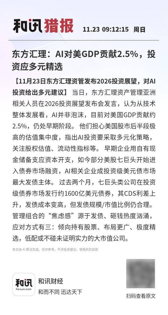 应对方式有三:倾向持有股票、布局更广、极度精 选,低配或不碰未证明实力的大市值公司。 本文由 Al 算法生成,仅作参考,不涉投资建议,使用风险自担 和讯财经 和而不同 迅达天下 【11月23日东方汇理资管发布2026投资展望,对AI投资给出多元建议】当日,东方汇理资产管理亚洲 相关人员在2026投资展望发布会发言,认为从技术整体发展看,AI并非泡沫,目前对美国GDP贡献约 2.5%,仍处早期阶段。 他们担心美国股市后半段极高的估值集中度,指出AI投资要采取多元化策略, 关注股权估值、流动性指标等。 早期企业用自有现金储备支应资本开支,如今部分美股七巨头开始进 入债券市场融资,AI相关企业成投资级美元债市场最大发债主体。 过去两个月,七巨头类公司在投资 级债券市场发行约1600亿美元债券,其CDS利差上升,发债成本变高,但发债规模/市值比例仍合理。 管理组合的"焦虑感"源于发债、砸钱热度汹涌,应对方式有三:倾向持有股票、布局更广、极度精选, 低配或不碰未证明实力的大市值公司。 本文由 AI 算法生成,仅作参考,不涉投资建议,使用风险自担 扫码查看原文 ...