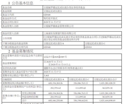 中国经济网北京11月18日讯今日,交银施罗德基金管理有限公司发布关于交银施罗德远见成长混合型证 券投资基金基金合同生效公告。 募集期间净认购金额1,021,281,028.39元,认购资金在募集期间产生的利息363,870.30元,募集份额合计 1,021,644,898.69份。 基金经理郭若2018年加入交银施罗德基金管理有限公司,曾任行业分析师,现任基金经理。 | 1 公告基本信息 | | | | | | --- | --- | --- | --- | --- | | 甚至名称 | 文银施罗德远见成长混合型证券投资基金 | | | | | 甚全简称 | 交银远见成长混合 | | | | | 甚至丰代码 | 025948 | | | | | 基金运作方式 | 製的型开放式 | | | | | 蒸金合同生效日 | 2025年11月17日 | | | | | 甚全管理人名称 | 交银施罗德基金管理有限公司 | | | | | 基金托管人名称 | 上海清东发展银行股份有限公司 | | | | | 公告依据 | 《交银施罗德远见成长混合型证券投资基金基金合同》、《交银施罗德远见成长 混合型正發投资基金招展或明书》 ...