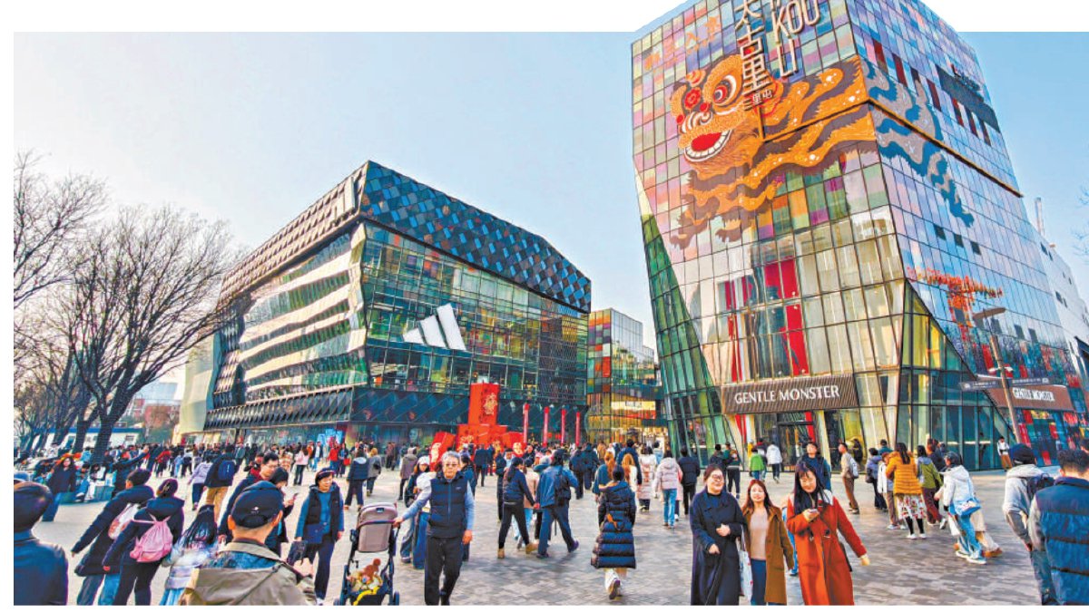 "狮头是怎么制作的?第一步是扎,然后是扑、写、装。"一位从江苏来北京旅游的母亲,俯身和8岁的女儿讲解狮头的制作工艺。小女孩踮起脚,努力凑近 那尊通体荧光绿的狮头,眼里满是好奇。 玻璃展柜中央,故宫版醒狮格外引人注目。该狮头从铜狮、宫殿建材与宫门结构中汲取形态灵感,将龙袍纹样、手绘吉祥图案融入设计,也是在北京首次亮 相。"很少在北京看到醒狮的展览,今天专程从大兴赶过来。"一位年轻市民举着手机,围着展品变换角度拍照。 去年年底亮相的一系列全球奢侈品牌的独栋旗舰店,春节期间也吸引众多游客驻足。"还是第一次来,太炫酷了!"北京市民李先生带着家人首次来打卡,外 立面形如花瓣的北京迪奥之家、在灯光映照下如同水晶宫殿的路易威登独栋建筑,都令他印象深刻。 春节期间,三里屯太古里商圈推出"狮王入京"主题展,将非遗舞狮装备融入街区新春布景,为商圈增添节日喜庆气氛,吸引众多市民游客前来观赏拍照。 本报记者 邓伟摄 本报讯(记者 夏骅)非遗醒狮"闯入"时尚街区,国际大牌旗舰店的灯光与春节红色装饰交相辉映,悠扬的古典音乐在潮流地标上空飘扬……正月初五,三 里屯商圈,传统与潮流的融合为市民游客带来一场新春盛宴,也带动了假期消费热。 昨天 ...