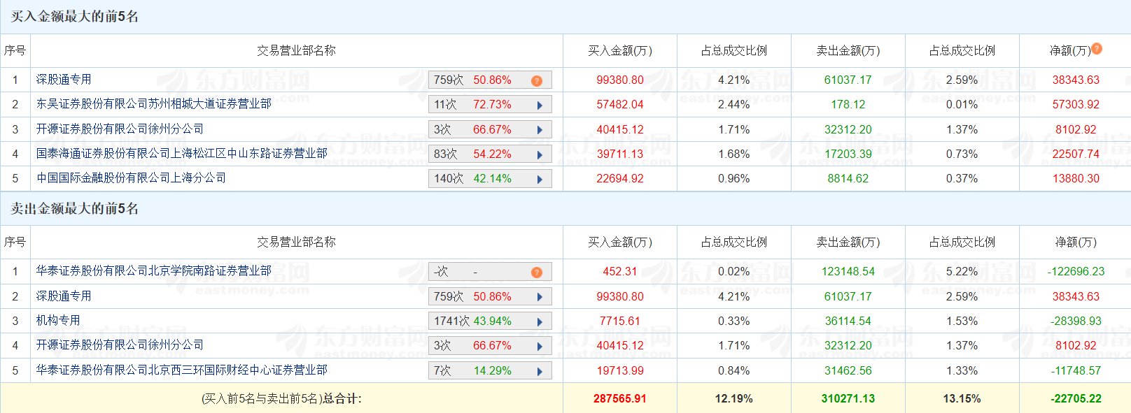 | 序号 | 交易营业部名称 | | | 买入金额(万) | 占总成交比例 | | --- | --- | --- | --- | --- | --- | | | 深股通专用 | 759次 50.86% | (2) | 99380.80 | 4.21% | | 2 | 东吴证券股份有限公司苏州相城大道证券营业部 | 11次 72.73% | ﻫ | 57482.04 | 2.44% | | 3 | 开源证券股份有限公司徐州分公司 | 3次 66.67% | | 40415.12 | 1.71% | | 4 | 国泰海通证券股份有限公司上海松江区中山东路证券营业部 | 83次 54.22% | | 39711.13 | 1.68% | | 5 土山人河日 | 中国国际金融股份有限公司 上海分公司 | 140次 42.14% | | 22694.92 | 0.96% | 蓝色光标(300058.SZ)今日20CM涨停,股价创历史新高,换手率34.96%,成交额235.89亿元。龙虎榜数据显示,深股通买入9.94亿元,卖出6.1亿元,净买入 3.83亿元;一家机构买入7716万元,卖出3.61亿元,净卖出2.84亿 ...