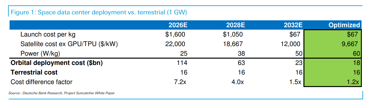 将高能耗的AI算力送入轨道,正从理论探讨走向经济可行性验证阶段。 据追风交易台消息,德银在1月14日的报告中表示,虽然目前的太空部署成本高昂,但这一差距正在以惊人的速度缩小。分析师预测,随着发射成本的暴跌 和卫星设计的优化,在未来十年内,建设一个太空数据中心的成本将与地面建设成本趋于平价。这意味着,困扰地面数据中心的能源和散热瓶颈,或将在太 空中找到终极解决方案。 成本鸿沟的快速弥合 德银的模型显示,目前在太空部署算力仍是昂贵的赌注,但转折点已在视线之内。 根据其测算,建设一个1吉瓦(GW)容量的太空数据中心,目前的成本至少是地面的7倍。然而,这一倍数将在本十年后期迅速收窄至4倍,并最终在2030 年代实现成本平价。报告指出: 发射成本暴跌是关键 实现这一经济性逆转的核心变量在于发射成本的断崖式下跌。模型假设,每千克发射成本将从2026年的1600美元,一路狂泻至2032年的67美元。 德银在报告中强调了完全火箭复用和运营规模化的重要性: 我们假设目前低地球轨道(LEO)的发射市场价格约为7000万美元或4000美元/千克。随着时间的推移,若是实现完全火箭复用和运营规模化, 这一成本可能大幅下降至1000万美 ...