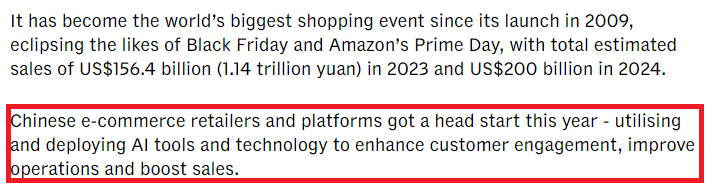 亚洲新闻台网站报道截图 中国一年一度的电商消费季"双十一"即将落下帷幕。"双十一"购物节自2009年诞生以来,见证了中国电商行 业的飞速发展。连日来,多家外国媒体对此进行了报道。 亚洲新闻台网站日前的一篇文章指出,一年一度的"双十一"是中国最大的网络购物节,各大电商平台都会推 出大幅折扣、直播购物等活动。自 2009 年推出以来,它也已经成为全球最大的购物盛事,超越了"黑色星期 五"和亚马逊Prime会员日等购物狂欢节。 美联社报道截图 该报道还关注了人工智能(AI)技术助力"双十一"购物节的发展。文章说,今年中国电商零售商和平台抢占 了先机,利用人工智能工具和技术来提高客户参与度、改善运营质量和提升销售额。文章还分析称,如今 的"双十一"可以一定程度上反映出消费者习惯的改变:越来越多的中国消费者开始注重性价比,理性消费仍 然是总体趋势。 英国《独立报》网站11日的一篇报道认为,"双十一"已成为全球最大的购物节,这个节日每年能创造超过数 亿美元的销售额,超过"黑色星期五"和亚马逊Prime会员日销售额的总和。每年,亚洲各地的零售商都会利 用"双十一"推出主题促销、预售和限量版产品等活动。报道还分析称,未来"双 ...