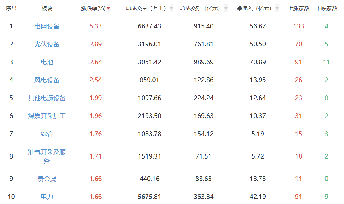 | 序号 | 板块 | 涨跌幅(%)▼ | | 总成交量(万手)▼ 总成交额(亿元)▼ | 净流入 (亿元) ▼ | 上涨家数 | 下跌5 | | --- | --- | --- | --- | --- | --- | --- | --- | | 1 | 电网设备 | 5.33 | 6637.43 | 915.40 | 56.67 | 133 | ব | | 2 | 光伏设备 | 2.89 | 3196.01 | 761.81 | 50.50 | 70 | ഗ | | 3 | 电池 | 2.64 | 3051.42 | 989.69 | 70.89 | ਰੇ1 | 11 | | ব | 风电设备 | 2.54 | 859.01 | 122.86 | 13.95 | 26 | വ | | 5 | 其他电源设备 | 1.99 | 1097.66 | 224.24 | 12.64 | 23 | 00 | | 6 | 煤炭开采加工 | 1.96 | 2193.50 | 169.63 | 10.37 | 31 | വ | | 7 | 综合 | 1.76 | 1083.78 | 154.12 | 5.19 | 15 | ...