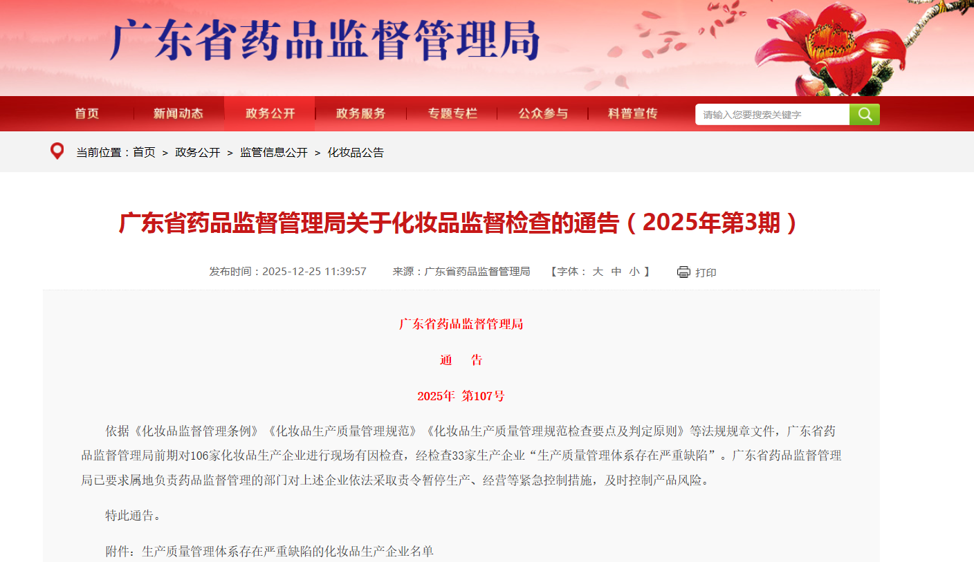 广东省药品监督管理局关于化妆品监督检查的通告(2025年第3期)