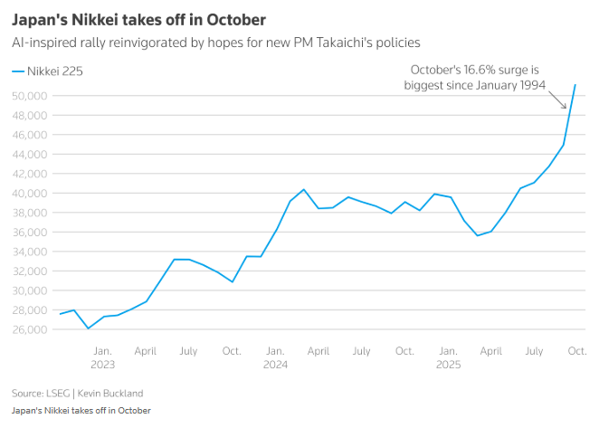 Group 1 - The Nikkei 225 index reached a historical high, closing at 52,411.34 points, with a monthly increase of 16.6%, the largest since January 1994 [1][4] - Amazon's cloud business revenue growth hit a three-year high, exceeding market expectations for quarterly sales guidance [4] - Apple's CEO Tim Cook provided forecasts for holiday season iPhone sales and overall revenue that surpassed Wall Street analysts' expectations [4] Group 2 - Japanese semiconductor stocks were significant contributors to the index's rise, with Socionext's stock soaring nearly 17% and Advantest rising 3.9% [4] - AI-related stocks, such as Hitachi, also performed well, with Hitachi's stock increasing by 7.2% [4] - The recent surge in technology stocks is driven by global excitement around AI and expectations of fiscal stimulus policies from Japan's new Prime Minister, Sanna Takashi [4] Group 3 - Mitsubishi UFJ Asset Management noted that the focus of Takashi's policies includes AI innovation, suggesting that Japanese tech stocks will benefit from both global tech trends and domestic policy support [4] - The chief market economist at Mitsubishi UFJ, Naoya Oshikubo, indicated that the Nikkei index's breakthrough of 52,000 points is just a stop on the way up, with an expected further increase of around 10% by April next year [4] - Oshikubo emphasized that the current upward trend is not a bubble [4]