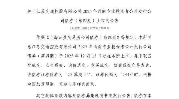 12月12日,上交所发布关于江苏交通控股有限公司2025年面向专业投资者公开发行公司债券(第四期) 上市的公告。 依据《上海证券交易所公司债券上市规则》等规定,上交所同意江苏交通控股有限公司2025年面向专业 投资者公开发行公司债券(第四期)于2025年12月15日起在上交所上市,并采取匹配成交、点击成交、 询价成交、竞买成交、协商成交交易方式。该债券证券简称为"25苏交04",证券代码为"244340"。根据 中国结算规则,可参与质押式回购。 来源:市场资讯 ...