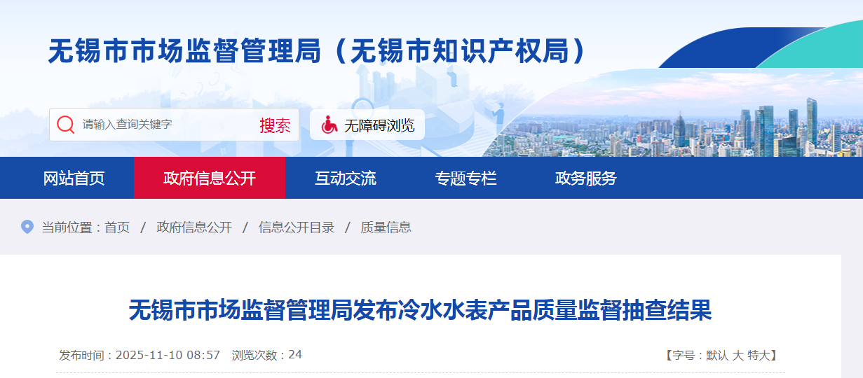 江苏省无锡市市场监督管理局发布冷水水表产品质量监督抽查结果