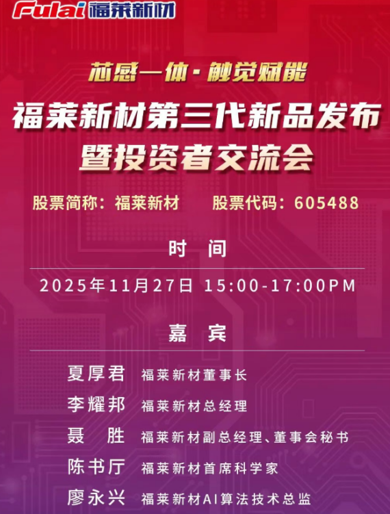 Core Viewpoint - The company, Fulad New Materials (stock code: 605488), is set to launch its third-generation flexible sensing system on November 27, 2025, which integrates flexible sensors, chips, algorithms, and large models, achieving multiple core technological breakthroughs [1][2]. Group 1: Product Development - The third-generation product will be unveiled during an investor communication event, showcasing advancements in flexible sensor technology [2]. - The company has successfully launched the first and second generations of flexible tactile sensors, with ongoing technological iterations and breakthroughs [2]. - The second-generation flexible sensor can perfectly conform to various complex surfaces, overcoming the physical limitations of traditional semi-flexible or flat sensors, enabling comprehensive tactile perception [2]. Group 2: Strategic Collaborations - The company has established a joint laboratory with the Zhejiang Tsinghua Flexible Electronics Technology Research Institute, led by algorithm and large model expert Dr. Liao Yongxing, to advance embodied intelligence ecosystem development [3]. - A strategic partnership has been formed with Tongzhi Technology to promote an integrated solution encompassing materials, perception, algorithms, and terminals [3]. Group 3: International Expansion - In September, the company established a wholly-owned subsidiary, Apex Sensing LLC, in California, USA, and formed a local business team to accelerate the integration of flexible sensing technology with the North American embodied intelligence industry [4].