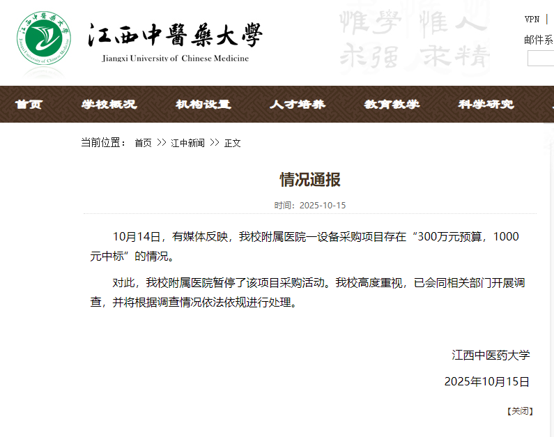 医院设备采购项目“300万元预算,1000元中标”,江西中医药大学通报:暂停采购,开展调查